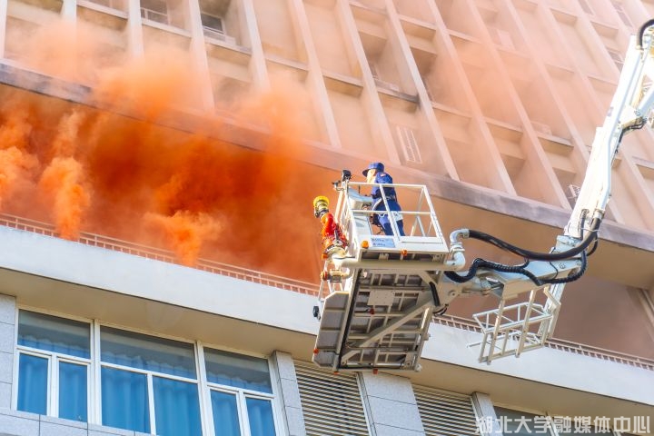 “报告总指挥,消防演练活动已准备就绪,请指示!”“开始演练!”随着一声令下,实训大楼内迅速弥漫起模拟浓烟,火灾逃生演练正式启动。楼内师生听从疏散组指挥,弯腰捂鼻、靠右沿步梯有序撤离;两名学生模拟被困人员留在指定楼层,等待专业救援。楼下消防云梯车随即启动,“机械臂”精准升空,稳稳抵达预设楼层,将两名被困学生安全转运至地面,整套动作干脆利落,现场响起阵阵掌声。